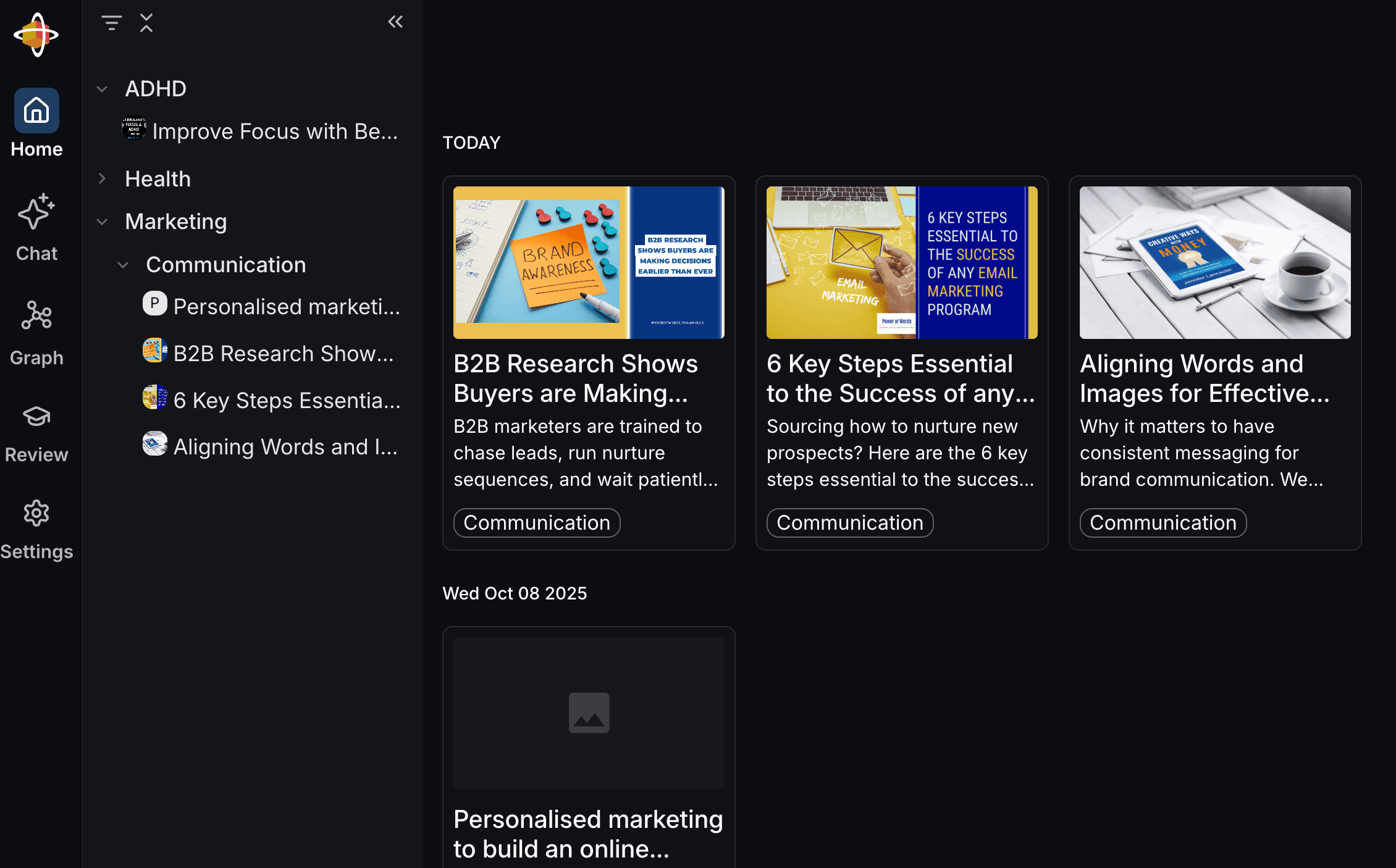 It’s called Recall. For those with ADHD, it’s a game changer. Going back to find something specific is so hard for us fast-movers, but this tool can pull it up by topic keyword or through a topic map. You can chat (interact) with what you wrote, for example, I asked it to list the six essential steps of email marketing (after saving the long blog post).